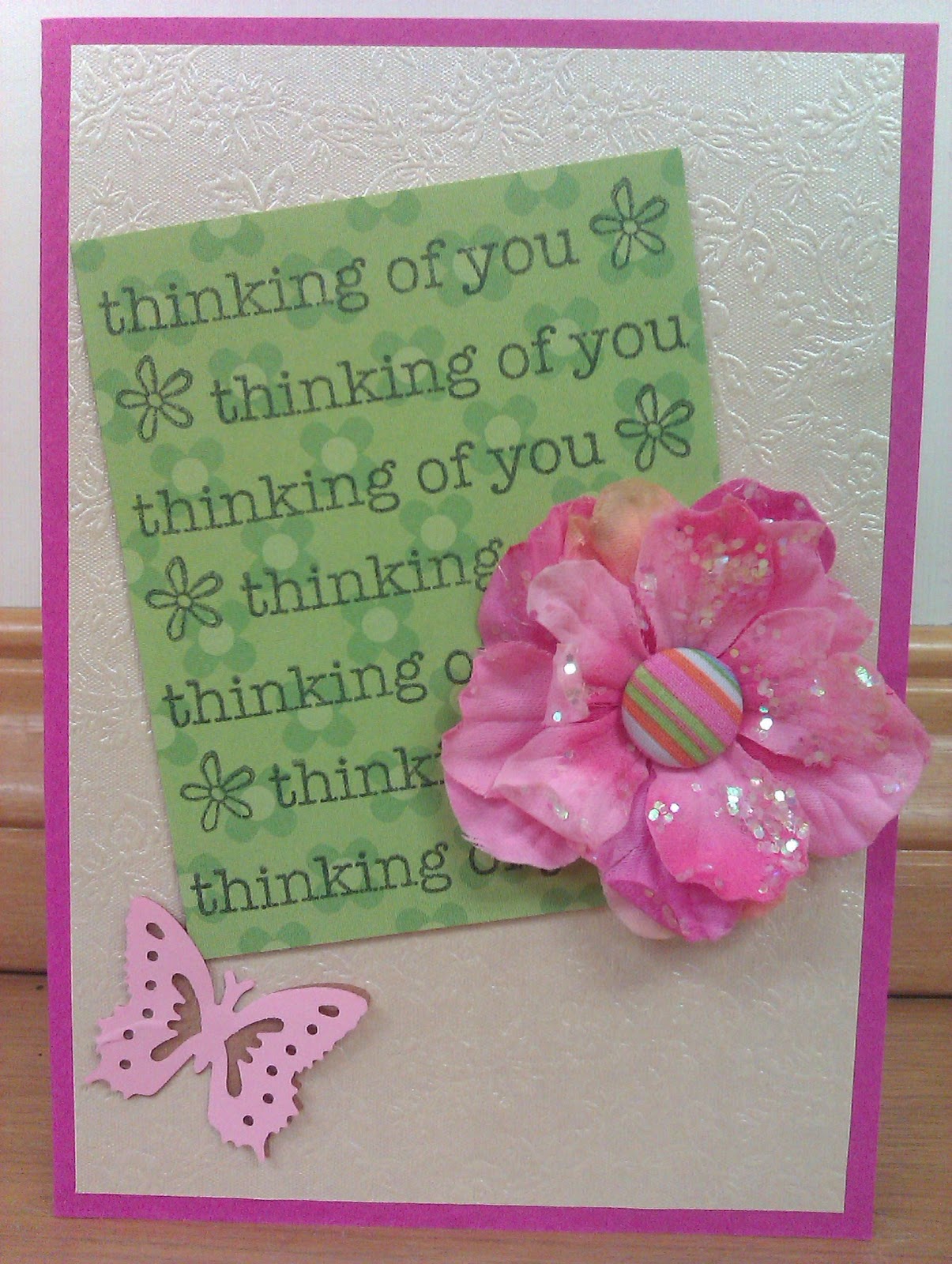 Susan made a very sweet "Thinking of You" card with a cute pink flower which we discovered at the Dua Puluh Sen discount store! Those flowers which were meant for Chinese New Year decorations ended up on our cards (we just had to take them off their stems and add a brad to secure the layers)! Haha. And that's what we call creativity, y'all!! Uhuh!